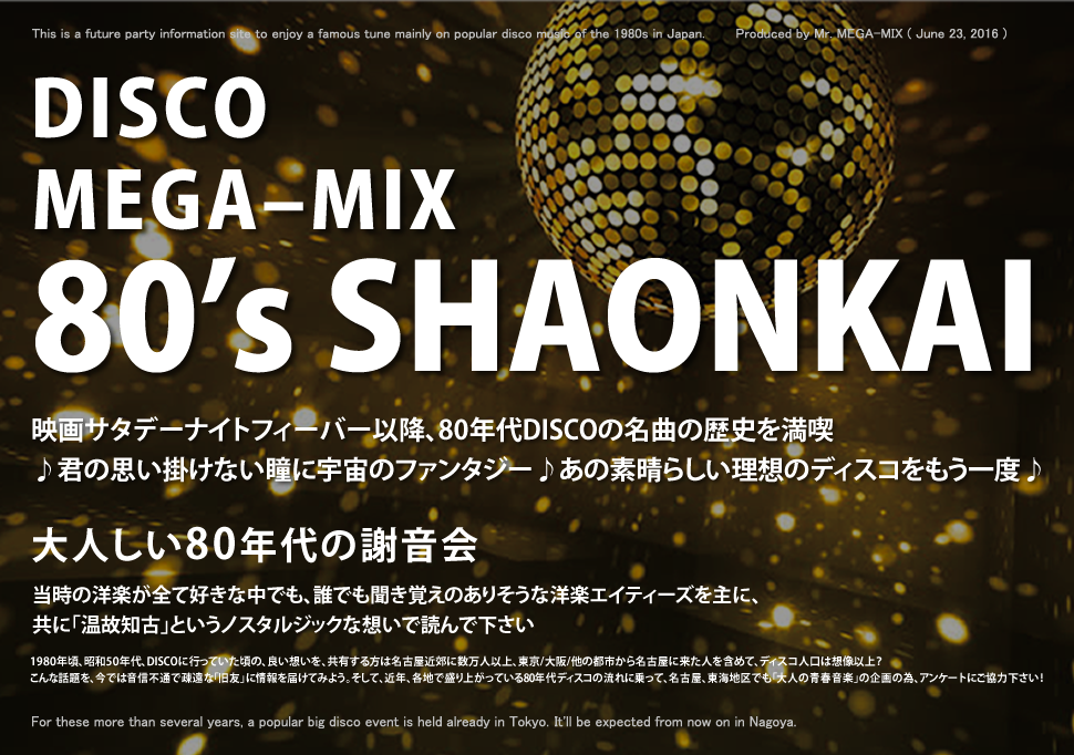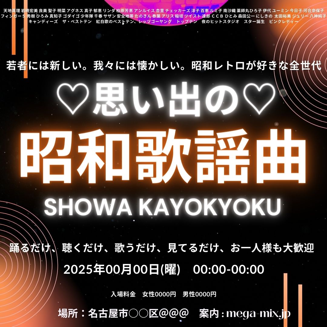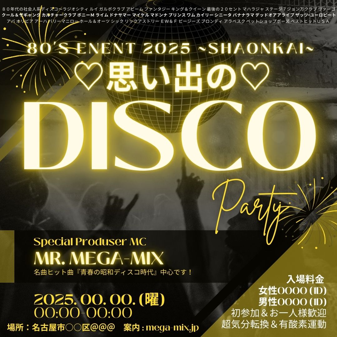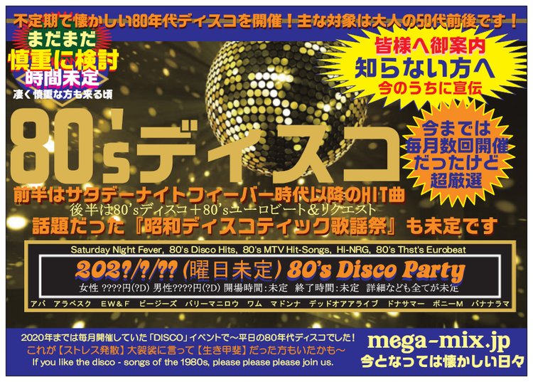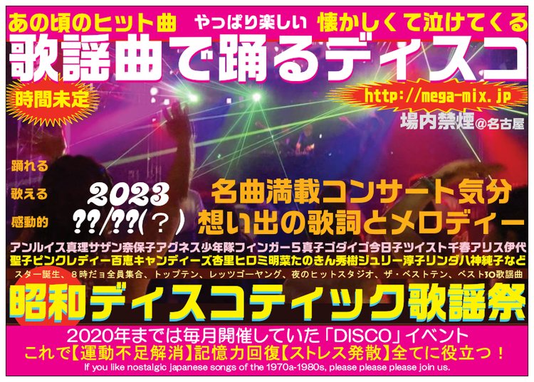 是非「歌謡曲ファン」「80'sディスコファン」の知り合いに、この様な情報を届けて頂けますと誠に有難いです。青春ソング満載 の特別空間(会場は禁煙) こぞって参加下さい。 ミスターメガミックス。